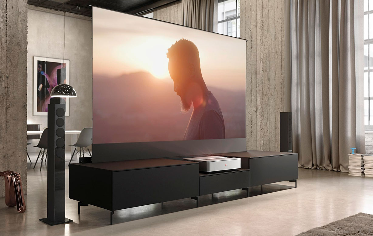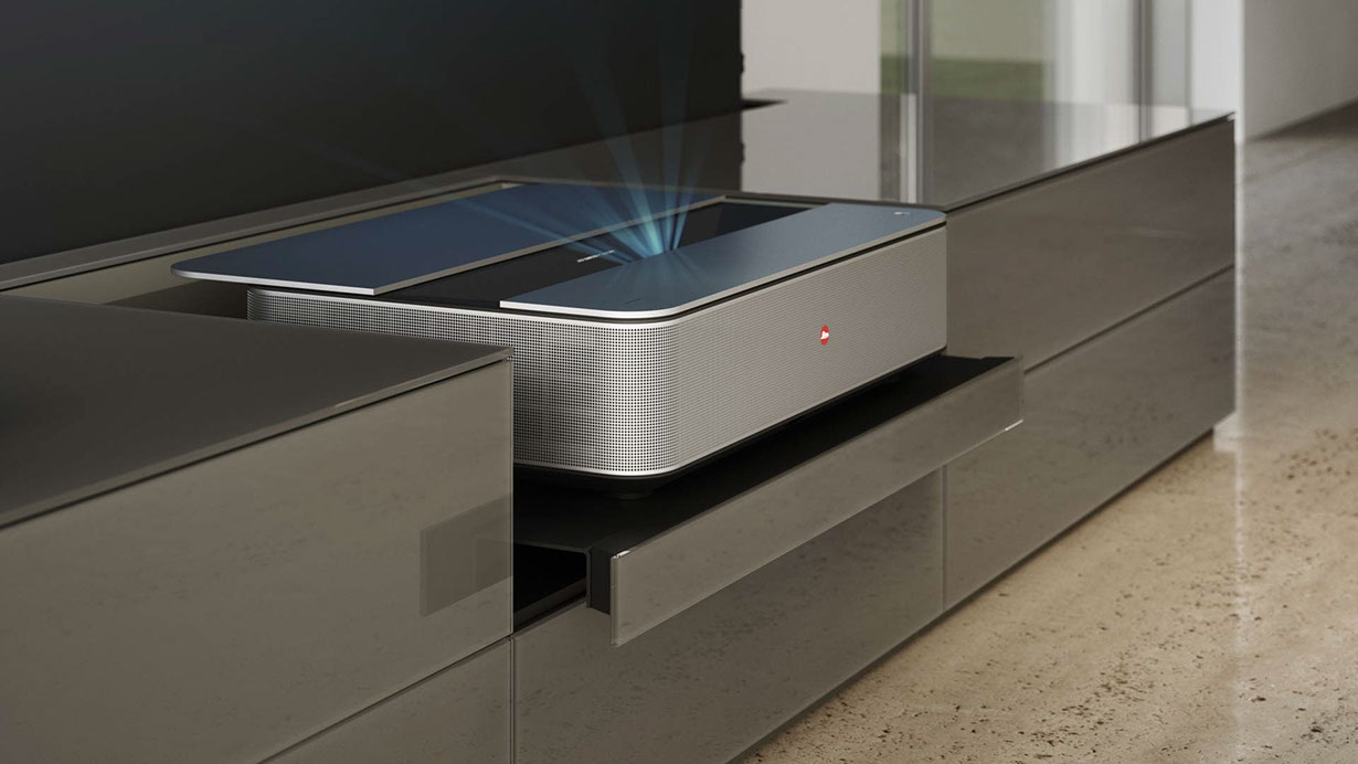 Jedes Möbelstück wurde speziell für die optimale Ultrakurzdistanzprojektion mit dem Leica Cine 1 entwickelt und ist für die motorisierte Celexon Roll-up Leinwand mit ALR-Funktion (Ambient Light Rejection) vorbereitet, die für intensivere Kontraste und eine raumfüllende Kinoatmosphäre sorgt.